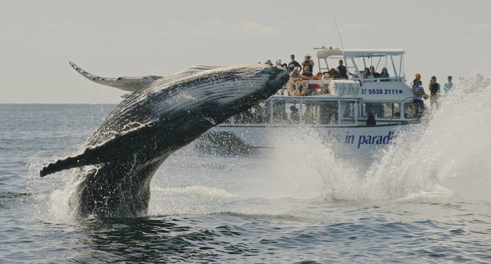 Departing twice daily in whale season from the Sightseeing Cruises Terminal, which is located on the corner of Cavil Avenue and the Gold Coast Highway (Ferny Avenue), you’ll begin your morning whale watching cruise by relaxing aboard the cruise vessel, which offers 360 degree views from all decks, as well as water level viewing platforms.